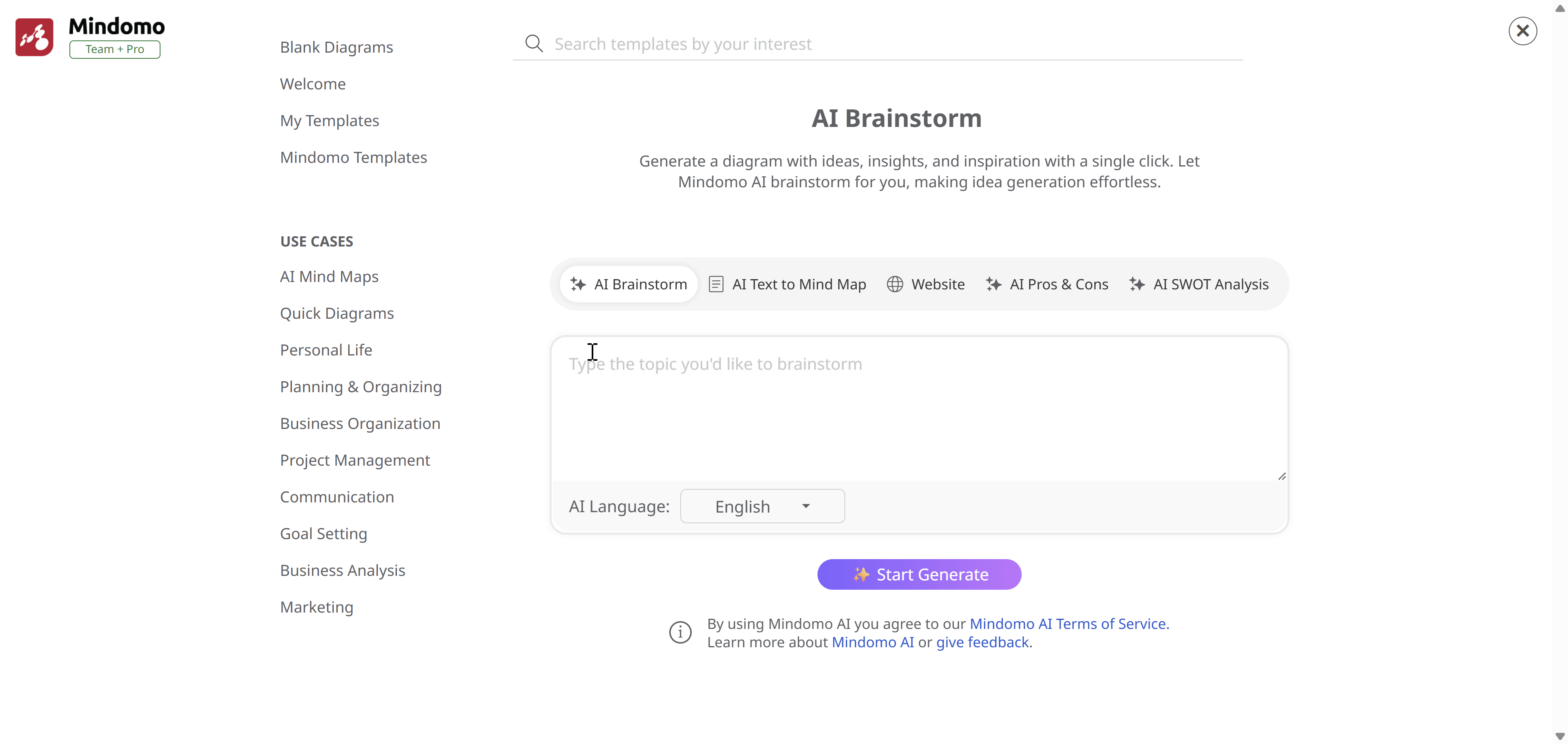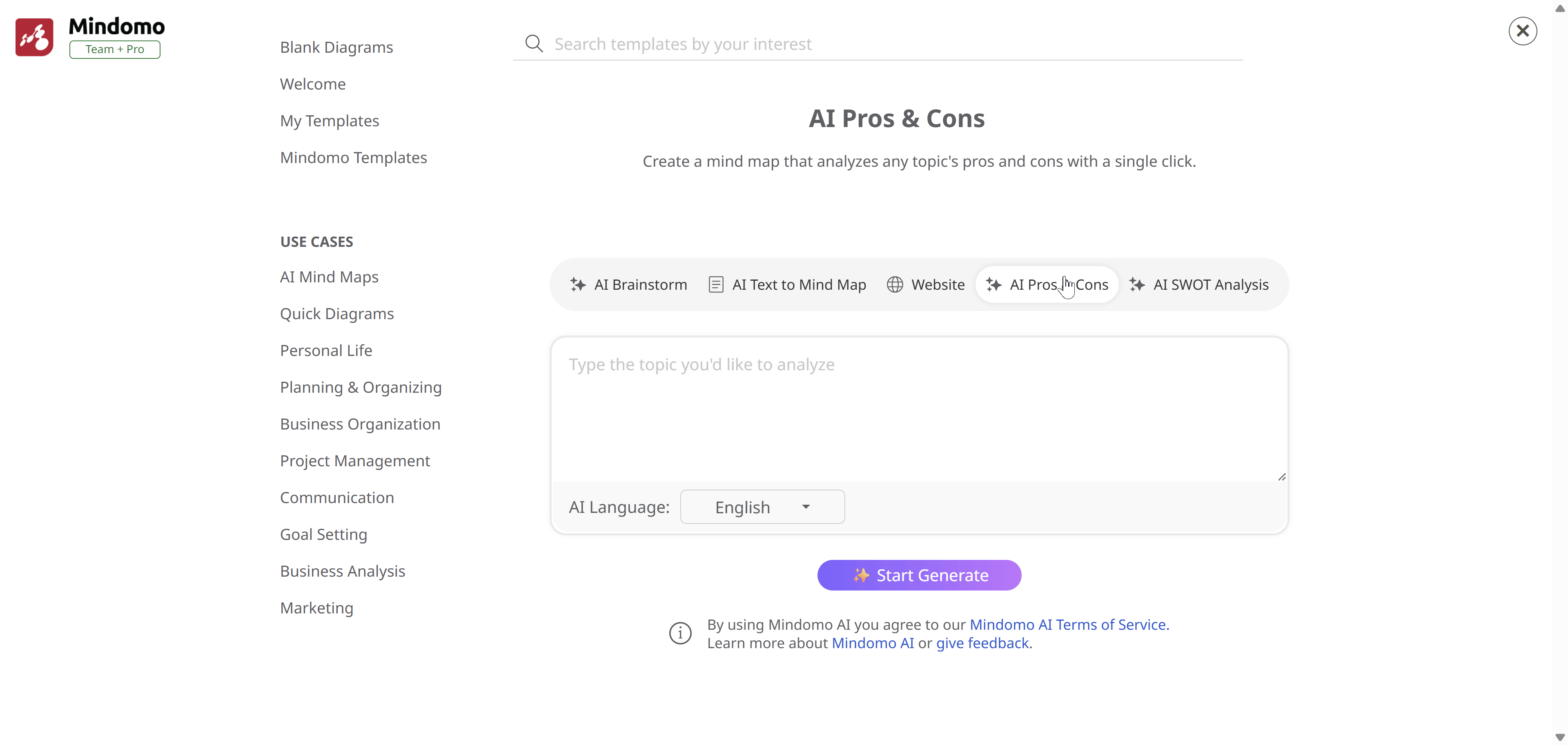 Section titled “Generate AI Pros & Cons Diagram”Begin crafting a Pros & Cons AI generated map from the ground up by choosing AI Pros & Cons. Next, specify the topic you’d like Mindomo AI to evaluate in the text box. Select the language in which you’d like the pros and cons analysis to be generated, or you have the option to leave the default setting (Auto detect). Finally, hit Start Generate, and watch as a map with branches highlighting the subject’s advantages and disadvantages materializes effortlessly.