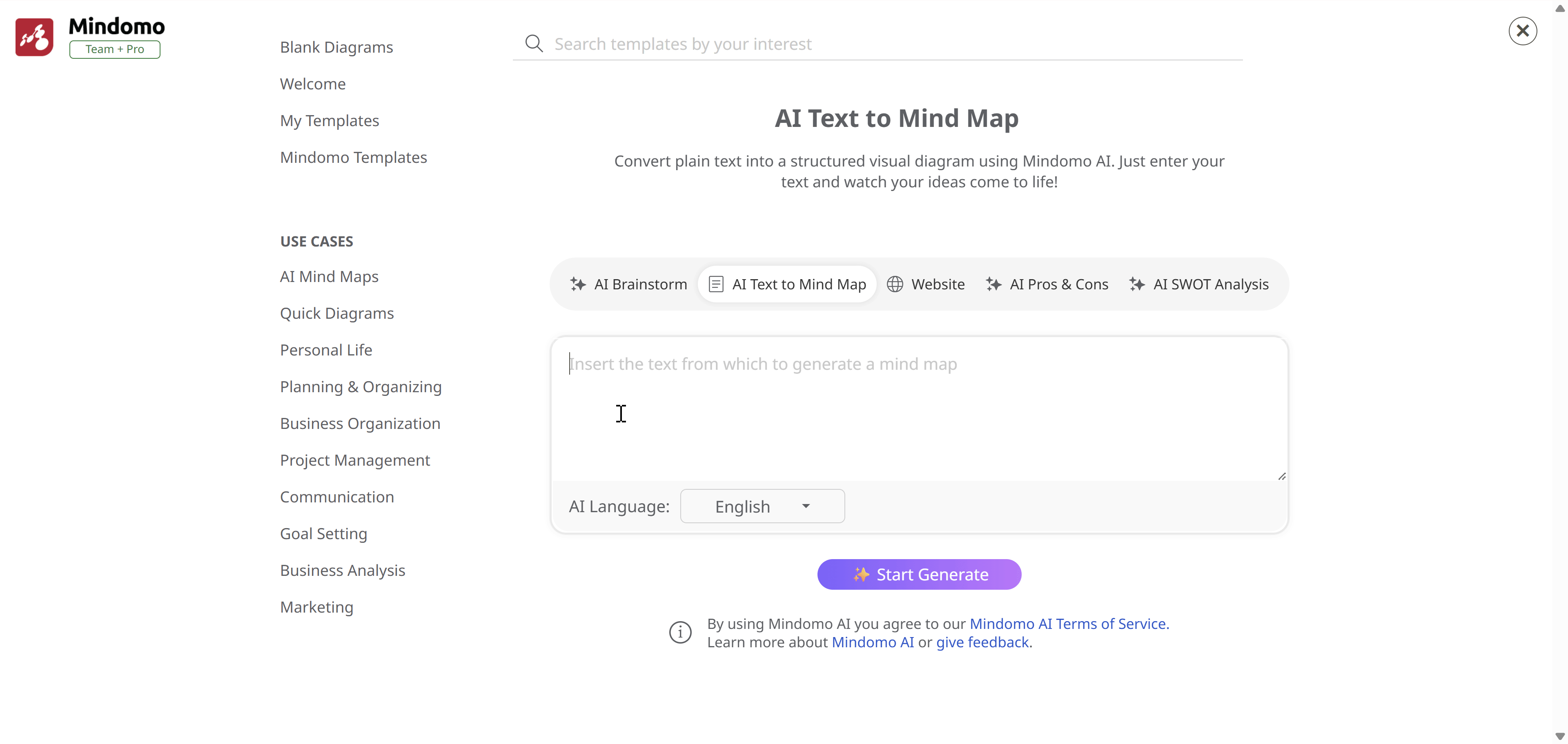 Section titled “Generate AI Diagram from Plain Text”With the help of Mindomo AI, you can turn plain text into a structured diagram. Choose AI Text to Mind Map, write or paste a block of text, click on Start Generate, and watch your ideas transform into a diagram.