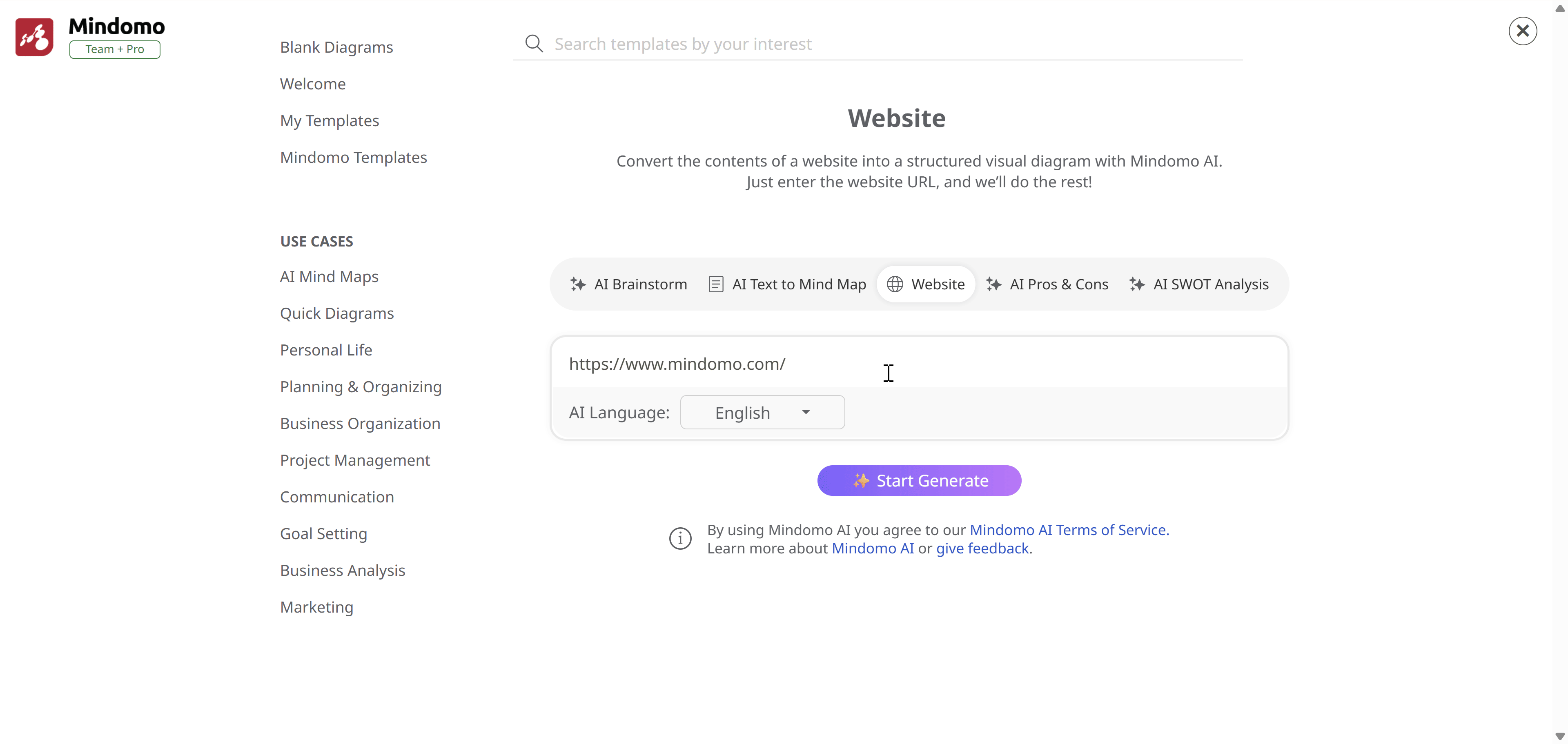 Section titled “Generate AI Website Diagram”Enter the website URL in the text box, select the desired language, and click Start Generate. A map will be created based on the website’s content.