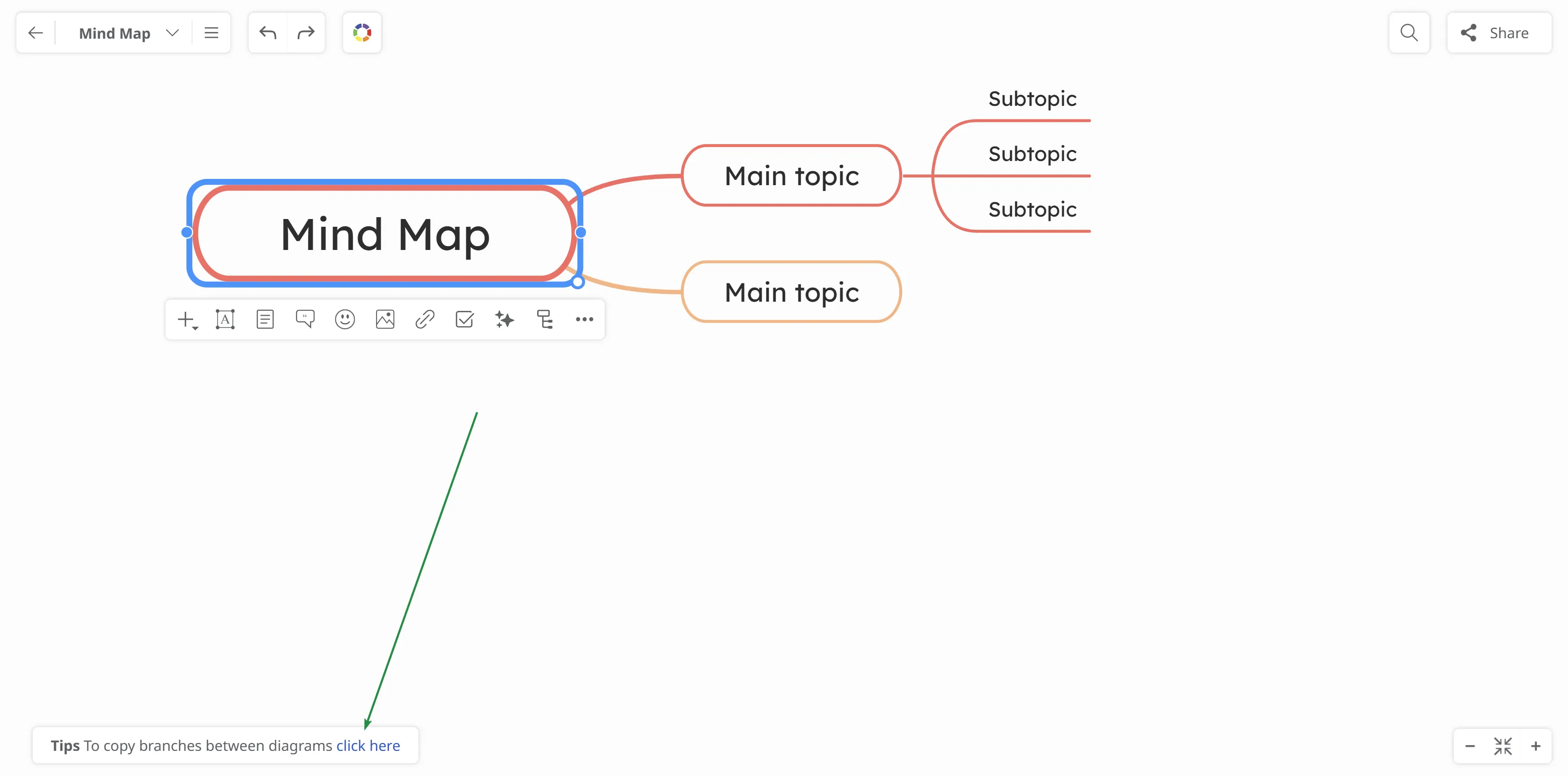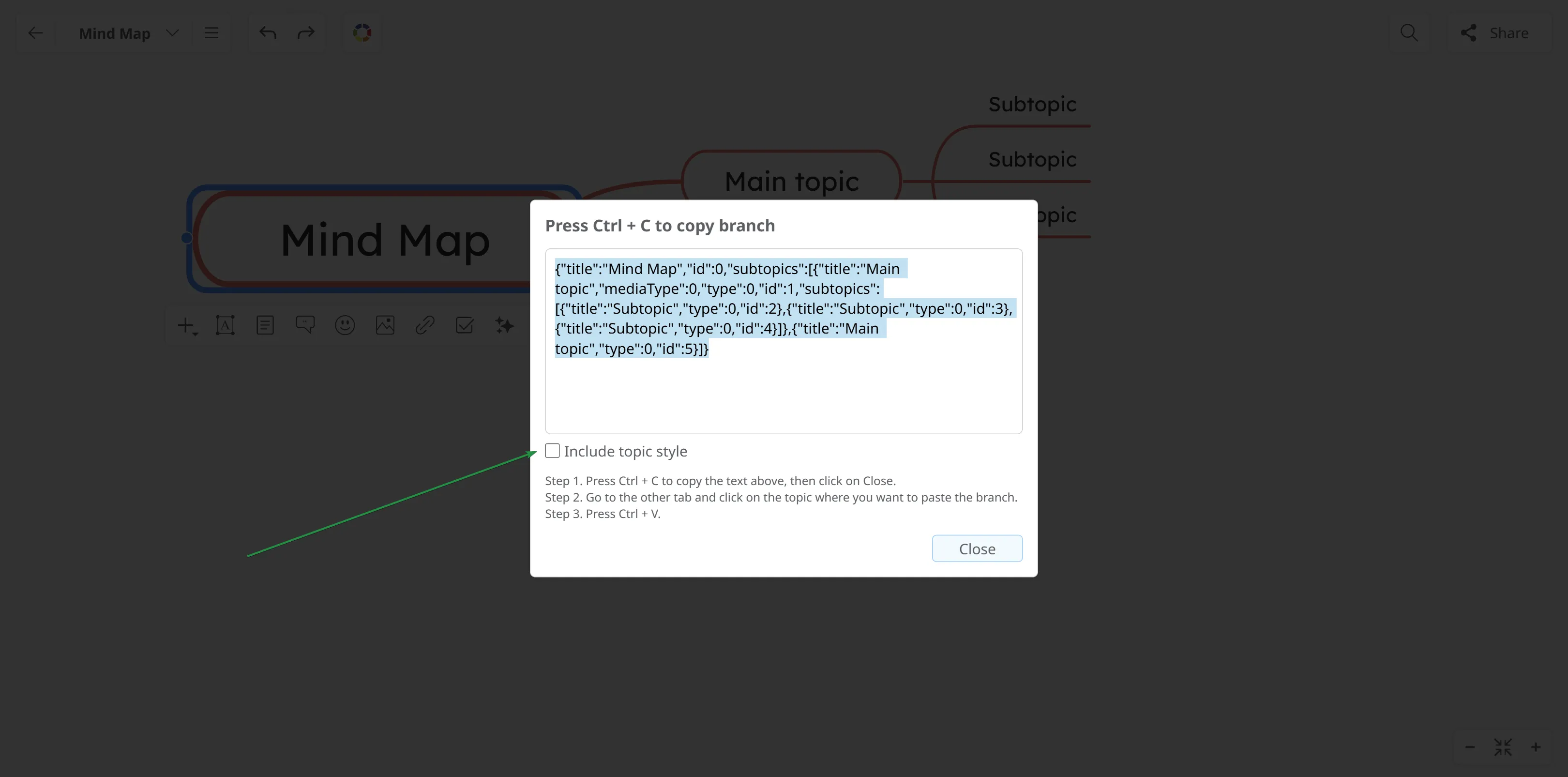 Click the root topic of the branch you want to copy, then click More → Tools → Copy Branch, or simply press Ctrl + C.