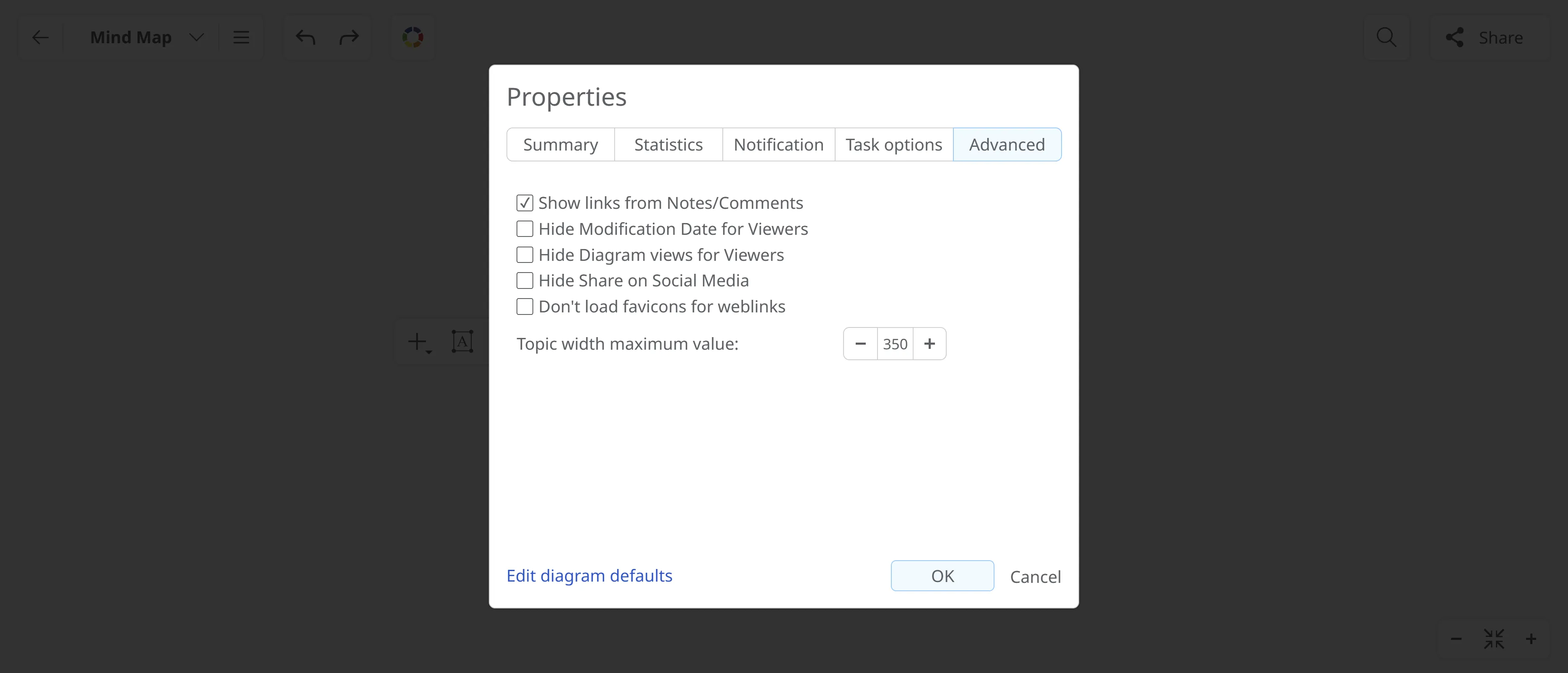 Section titled “Advanced Settings”From the Advanced tab you can customize your map’s display by managing link visibility, viewer options, social sharing settings, and the maximum topic width.