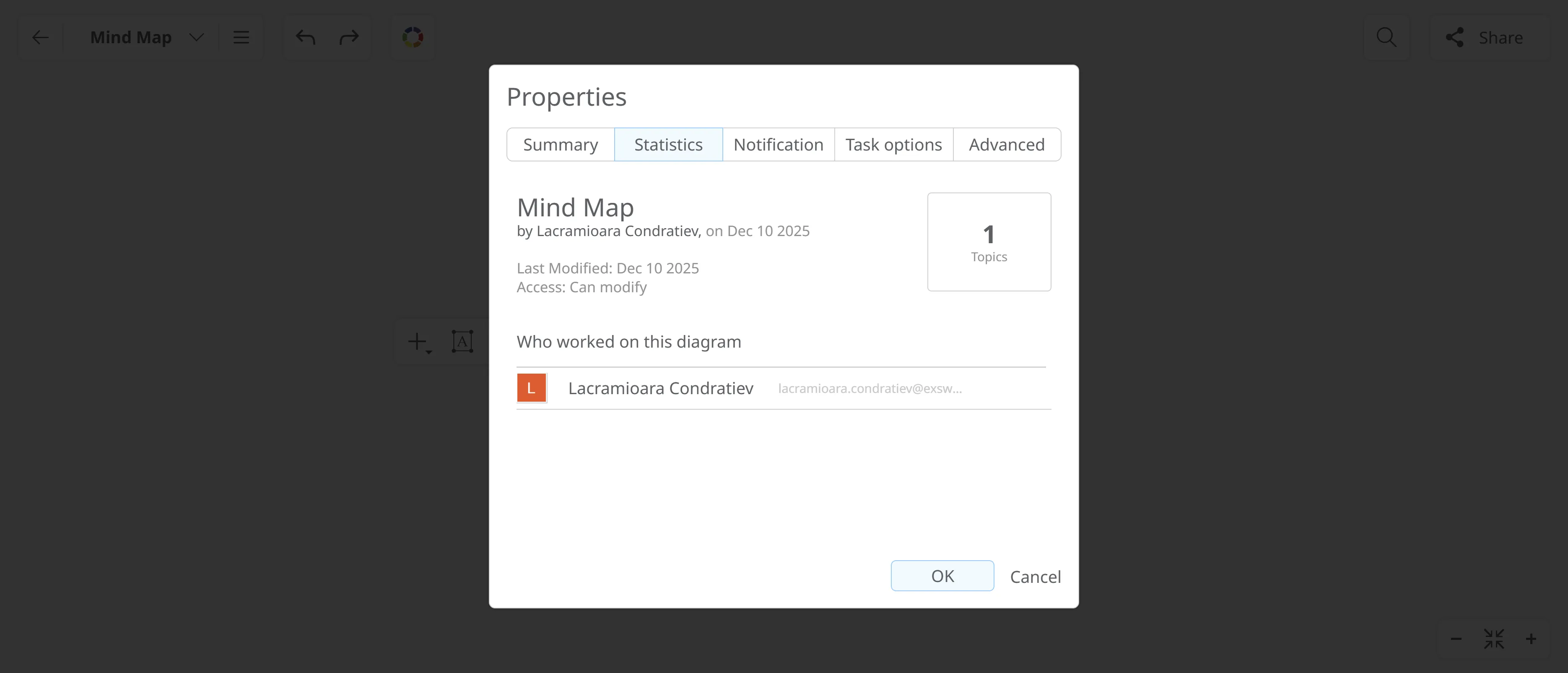 Section titled “Usage Statistics”The Statistics tab shows who created and last modified the diagram, the date of last changes, access level, and the number of topics included.
