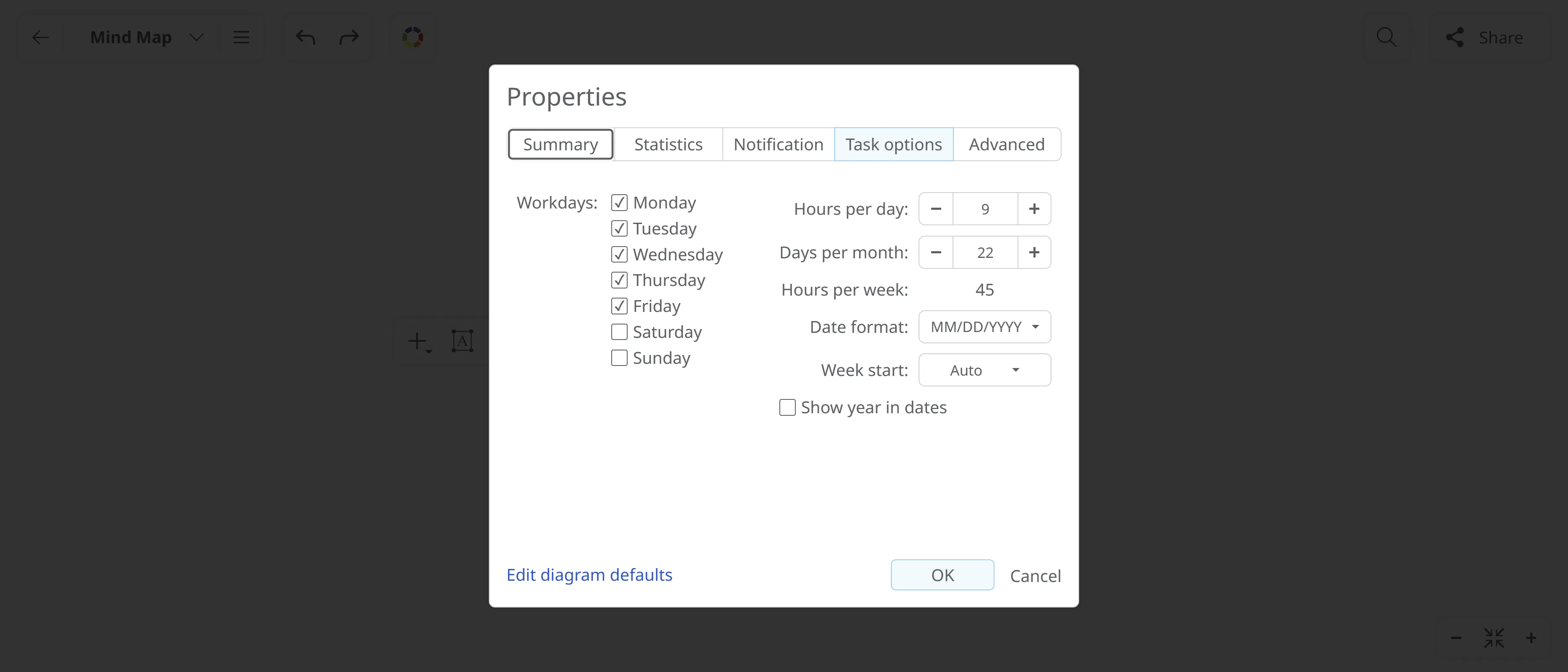 Section titled “Task Options”Use this section to set time and work-related preferences for tasks planning in your diagram. These settings ensure more accurate scheduling and time tracking.