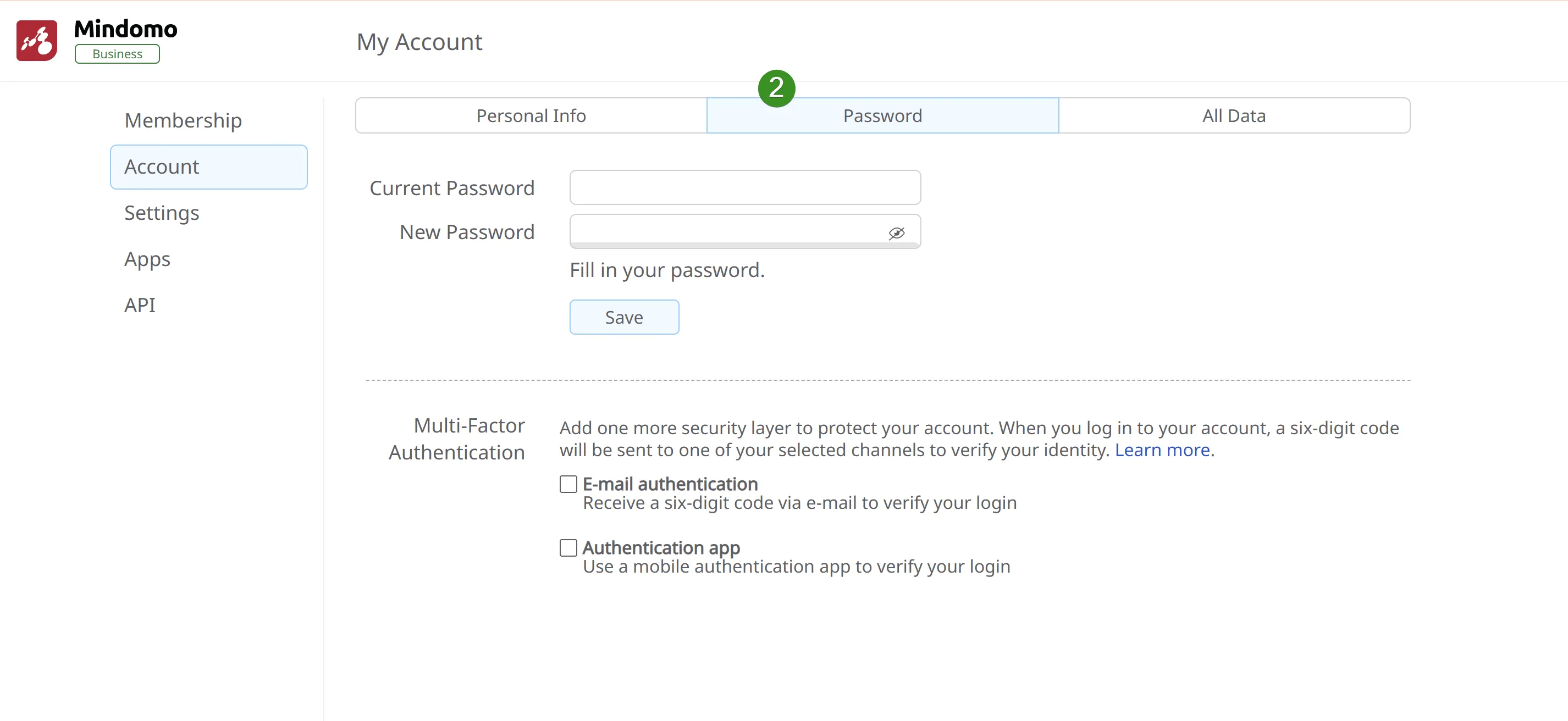 - To change your password, go to the ‘Password’ section on the next tab, type in your current password and the new password, then click on ‘Save’. If you forgot your password or you don’t know it because you signed up through a third-party account, use this link to set a new password: [https://www.mindomo.com/forgotpassword].