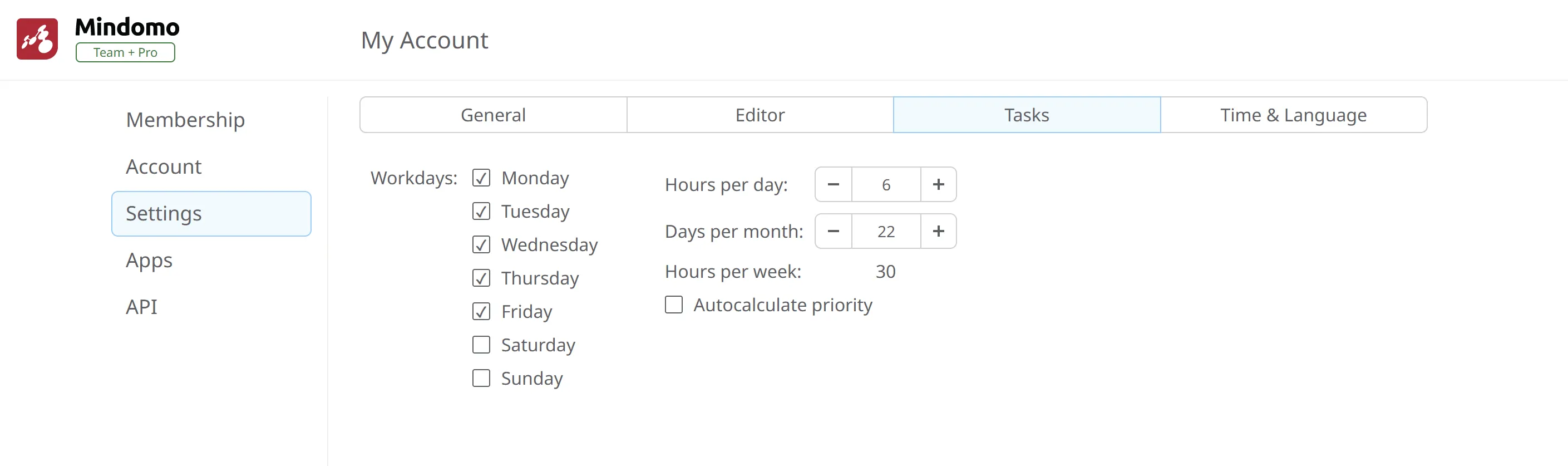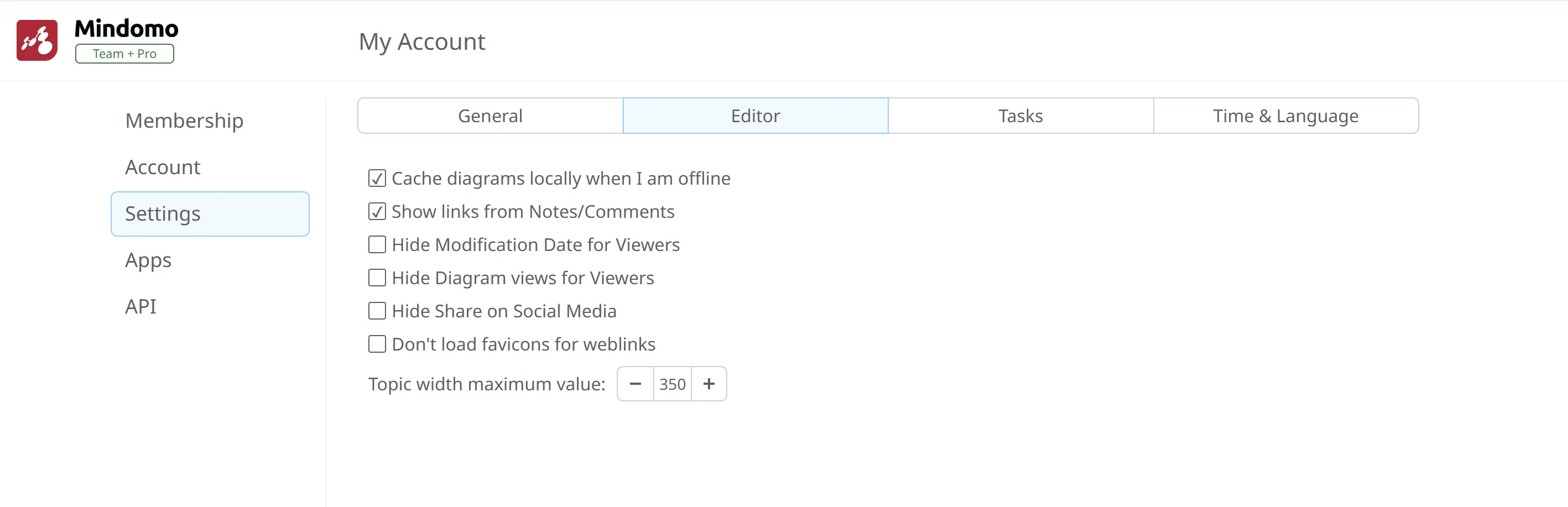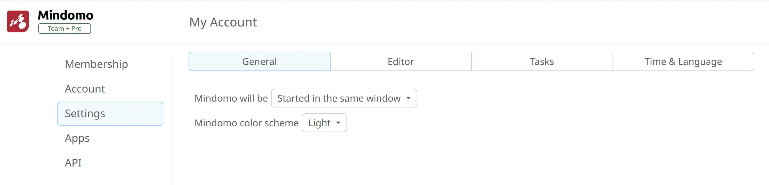 Section titled “Settings”The Settings tab allows users to customize how Mindomo behaves and appears for their account.
