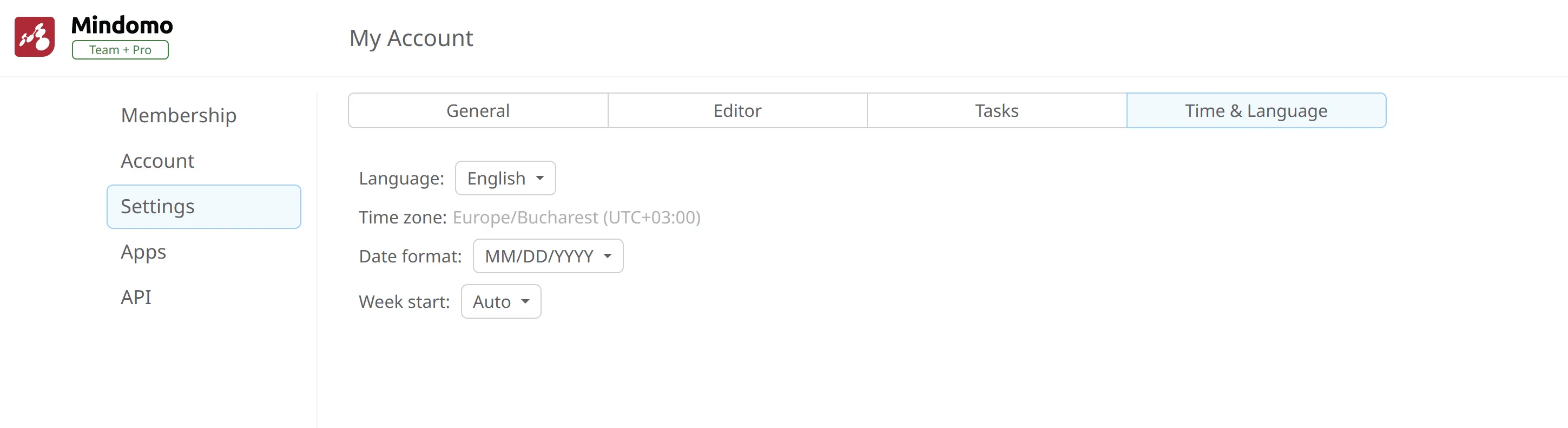 These settings allow users to adjust the interface language, date format, and week start day. The time zone is displayed but not editable.