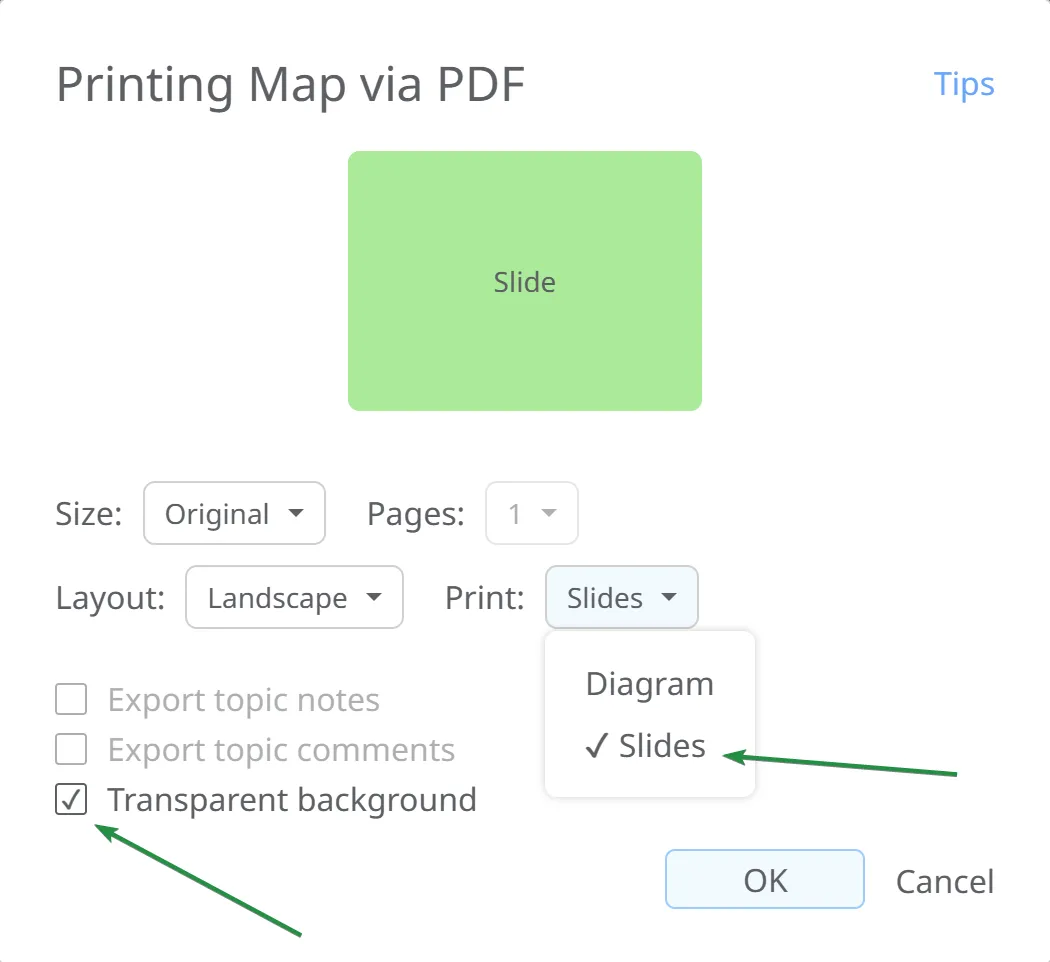 Section titled “Slides as PDF printing”If you have a premium account and you wish to print a large map, you can print the slides individually after exporting your diagram’s slides as PDF. To do this, follow these steps: