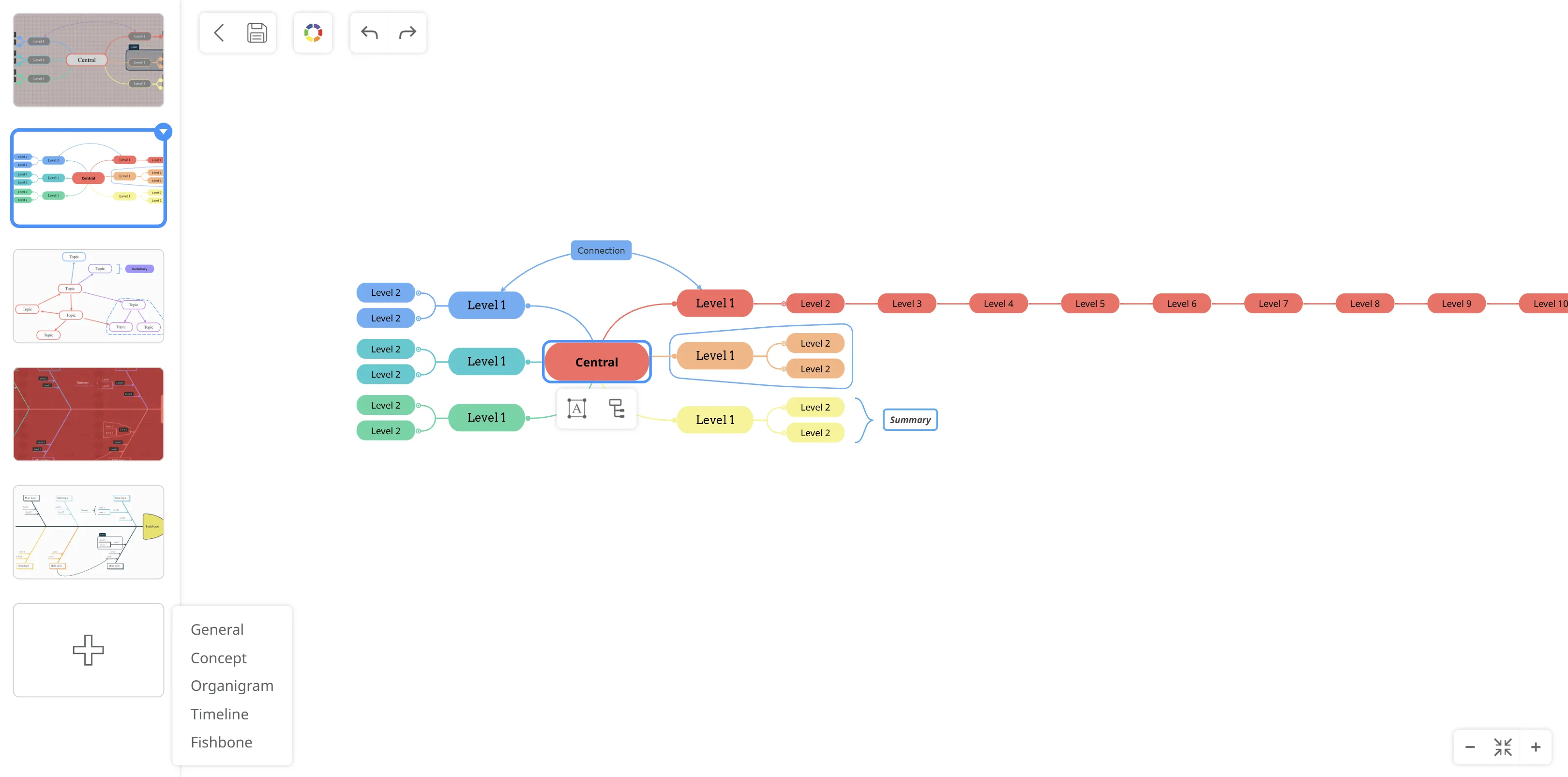Section titled “1. Style & Layout”Access a variety of theme styles designed for different layouts such as mind maps, tree charts, organigrams, fishbones, and timelines. Each style offers distinct shapes, connectors, fonts, and line designs.