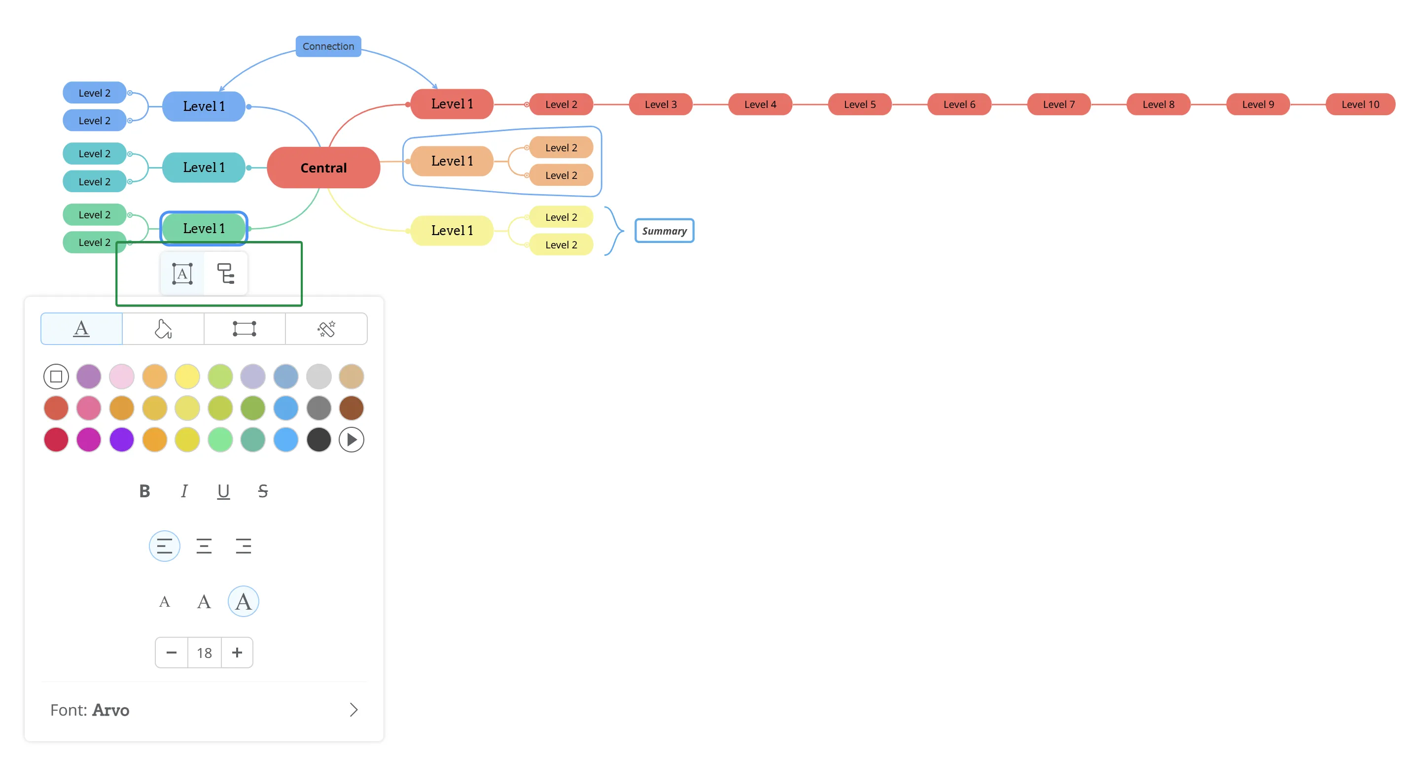 The Theme Editor gives you the possibility to quickly change the way your topics look like, level by level (central topic, main topics, level 2 subtopics, etc.).
