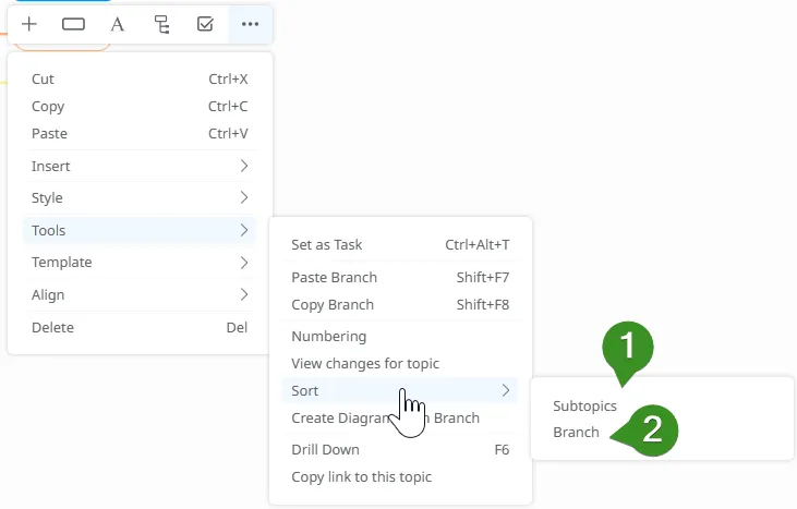Section titled “Sort Subtopics/Branch”You have the option to sort the subtopics of a branch in alphabetical order (1) or sort the branch (2).